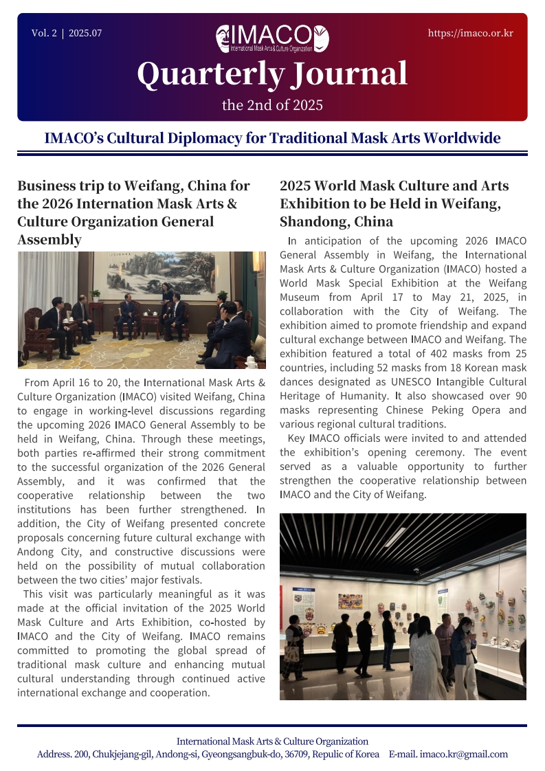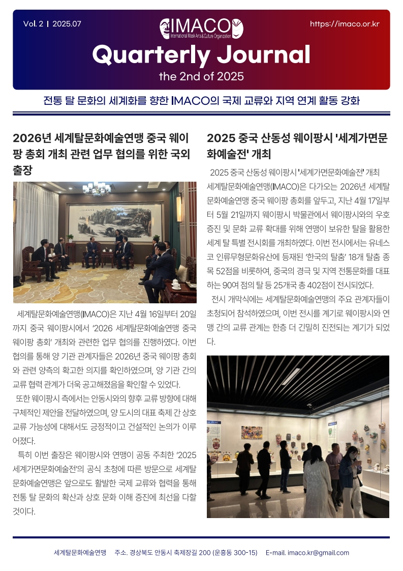목록 Quarterly Journal the 2nd of 2025 작성자 : IMACO | 등록일 : 25-06-27 15:57 | 조회 : 204회 첨부파일 IMACO_Quarterly Journal the 2nd of 2025_kor.pdf IMACO_Quarterly Journal the 2nd of 2025_eng.pdf 본문 이전글Quarterly Journal the 3rd of 2025 다음글Quarterly Journal the 1st of 2025 목록