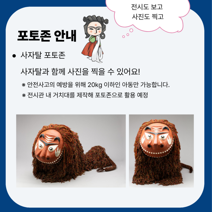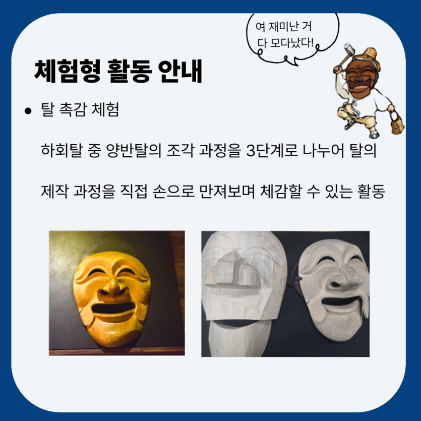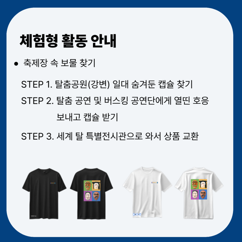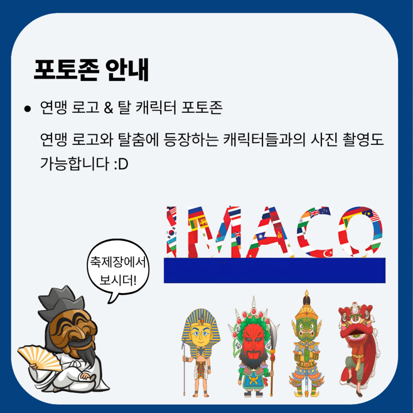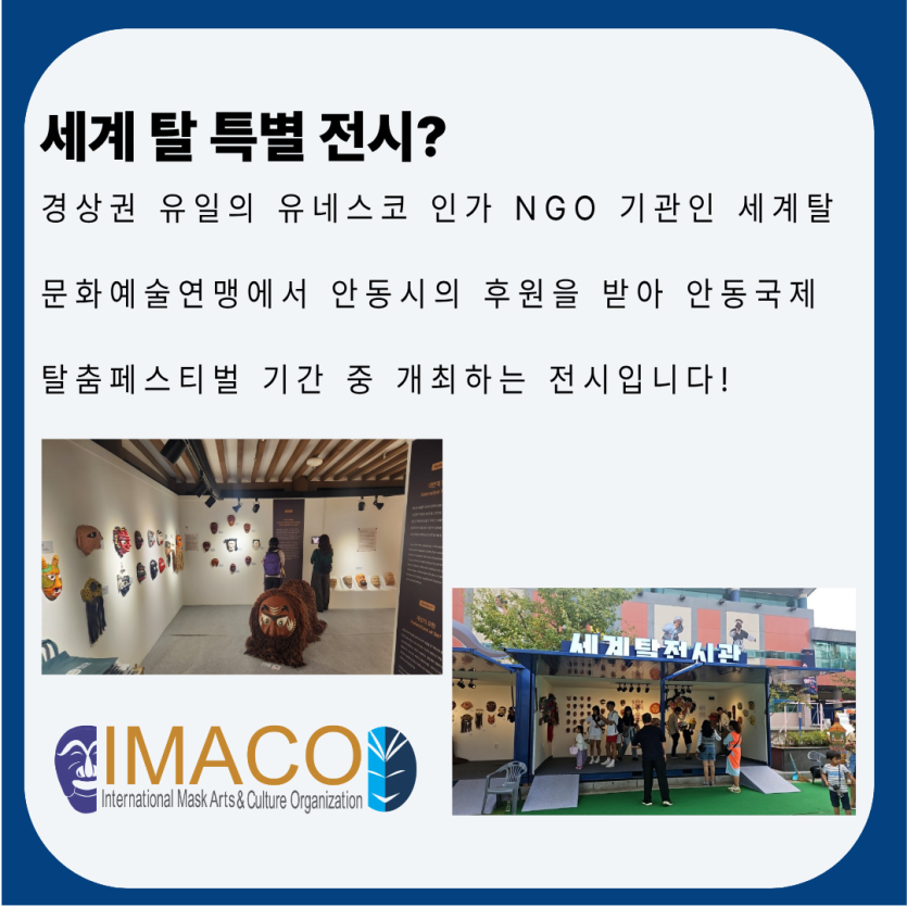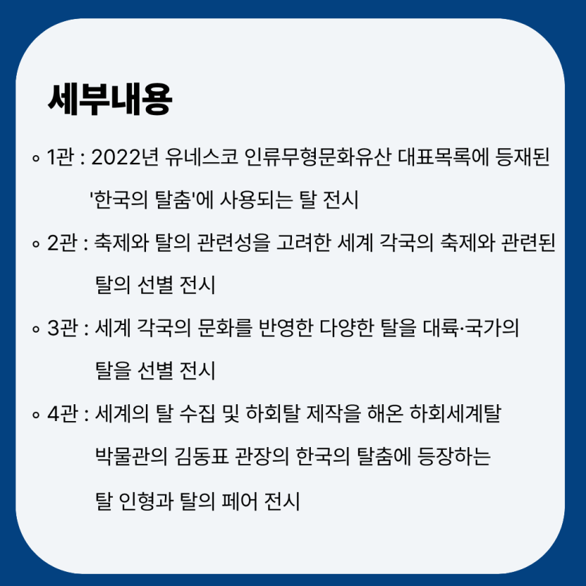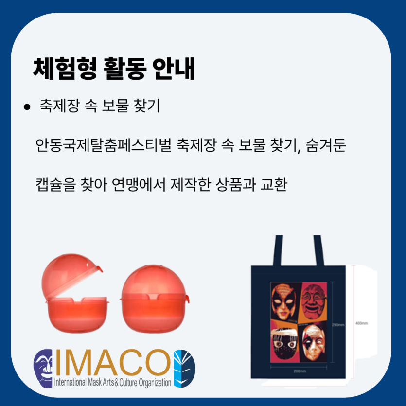 세부 구성은 ▲1관: ‘한국의 탈춤’ 전시 ▲2관: 축제와 탈(가면)의 관계성 제시 ▲3관: 인류 보편문화로서 탈의 의미와 특수성 탐구 ▲4관: 하회세계탈박물관 김동표 관장이 제작한 탈 인형 및 전통 탈 전시 등으로 꾸려질 예정입니다. 이를 통해 한국 탈 문화의 가치와 전승·보존의 중요성을 국내외에 알리고자 하며, 이외에도 양반탈을 활용한 제작 과정 소개와 촉감 체험, IMACO 제작 티셔츠·에코백을 받을 수 있는 ‘축제장 속 보물 찾기’, 사자탈 및 연맹 로고 포토존 등 다채로운 참여 프로그램을 준비하여 축제 관람객의 흥미를 더하고자 합니다.