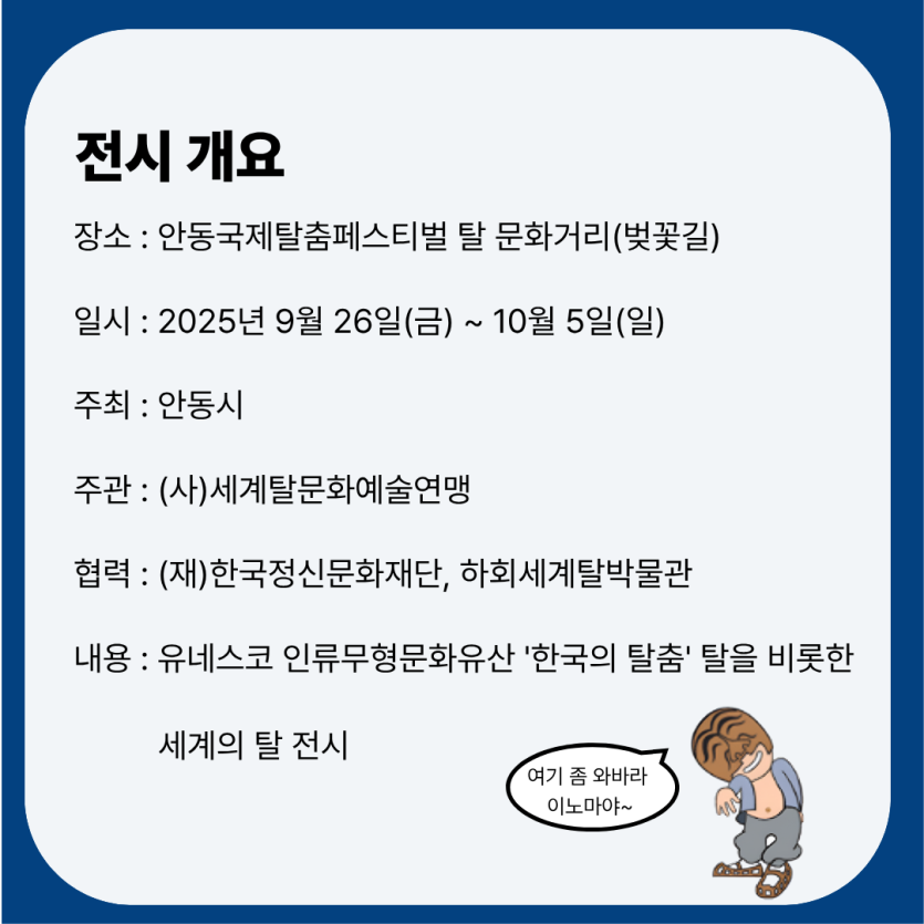 2024년에 이어 세계탈문화예술연맹에서 다시금 '세계 탈 특별 전시회'를 진행합니다. 이번 전시는 축제 현장에 조성되는 ‘탈 문화 거리’ 내에 마련되며, 지난해보다 한층 확대된 규모로 진행됩니다. 전시에는 유네스코 인류무형문화유산 대표목록에 등재된 ‘한국의 탈춤’에 사용되는 전통 탈과 세계 각국의 다양한 탈이 함께 소개될 예정입니다. 특히 하회세계탈박물관과 협력해 준비한 탈 인형 전시는 관람객들에게 새로운 문화 체험의 기회를 제공할 수 있을 것으로 기대됩니다.